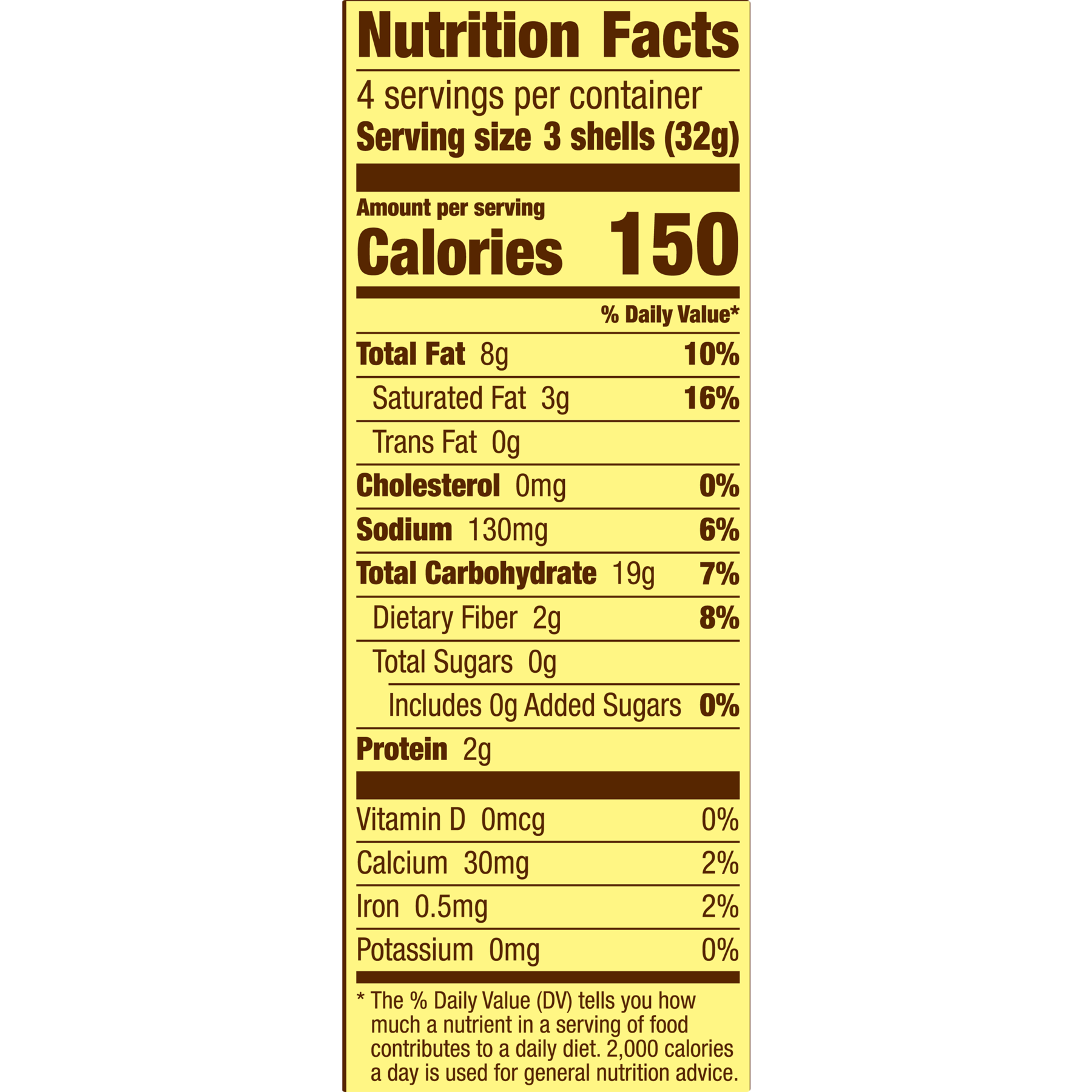 - Per 3 Shells: 150 Calories.