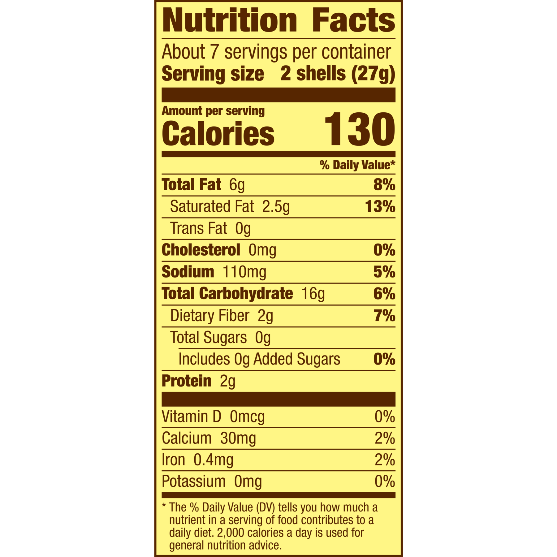 - Per 2 shells: 130 Calories.